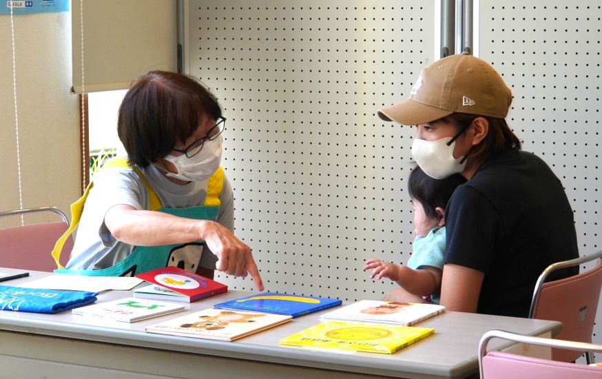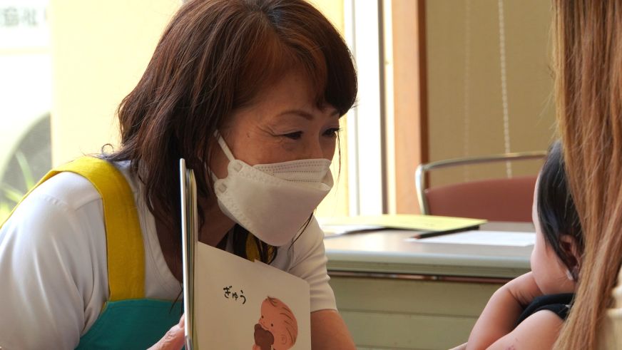 そんな優しい語りかけとともに絵本を読むのは、ボランティアの八尋典子さんと匹田博子さん。赤ちゃんだけでなく、保護者にも声をかけて、会話をするように絵本を読んでいます。健診で少し疲れた様子の保護者も自然と表情がほぐれていきました。