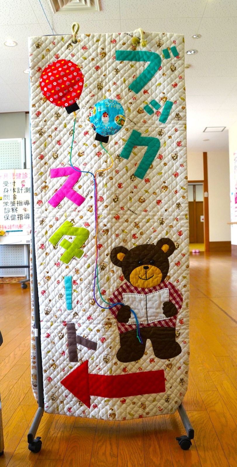 有田町では、7か月児健診の最後にブックスタートを行っています。会場ではボランティアが手作りしたパッチワークのタペストリーが親子をお出迎え。1組ずつに6冊の絵本を読みきかせした後、その中から2冊をプレゼントしています。